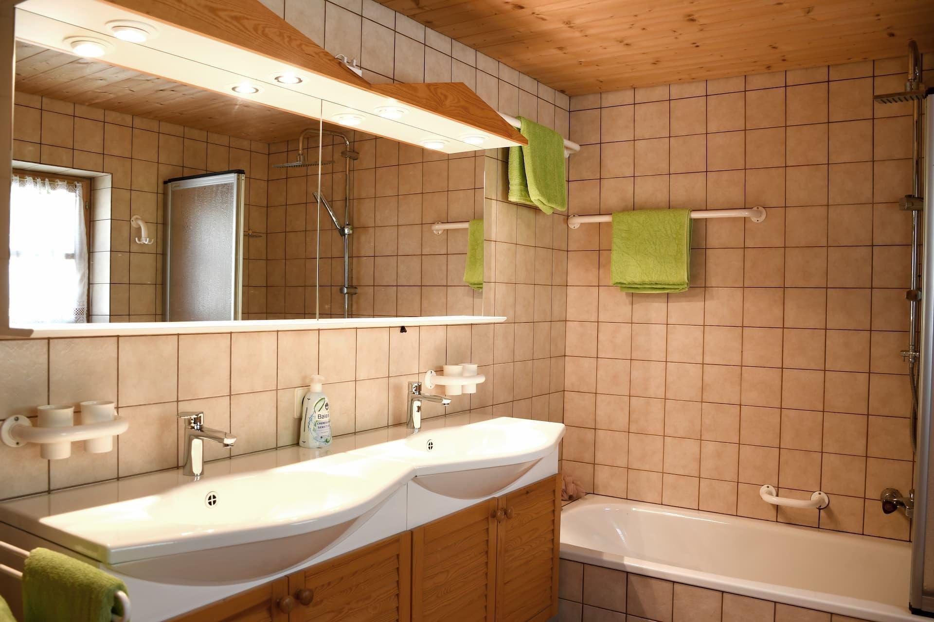 Moderne Ausstattung für Entspannung und ErfrischungDie Alpenlodge Madau bietet Dir nicht nur gemütliche Schlafplätze, sondern auch moderne Badezimmer, die für Komfort sorgen. Im Erdgeschoss steht Dir ein Badezimmer mit Dusche und WC zur Verfügung, während das großzügige Badezimmer im Obergeschoss mit Badewanne, zwei Waschbecken und WC viel Platz für Erholung und Entspannung bietet.